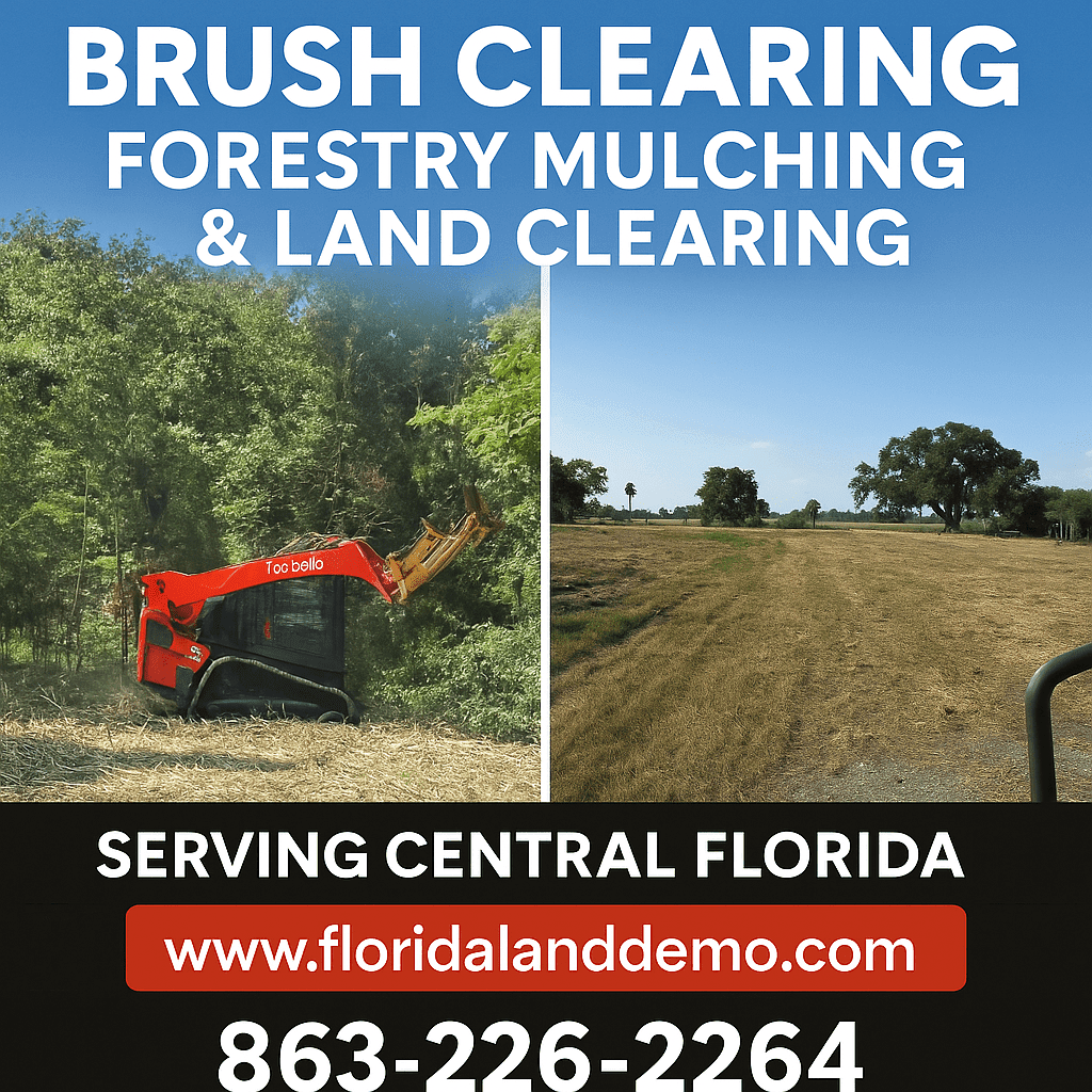 Central Florida Land & Demo is your go to for excavating, tree services, and responsible forestry work right here in the Lakeland area. I specialize in land clearing, including limited forestry mulching for a greener approach, and handle limited demolition projects with precision and care. You can count on me for reliable service, transparent pricing, and a commitment to doing the job right, safely and efficiently. I'm dedicated to quality work that respects both your property and the environment. Give me a call today to discuss your project and get a free quote.